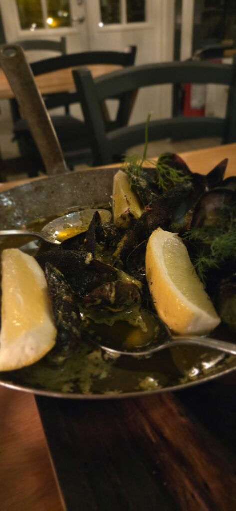 Det ble middag/kveldsmat på Petersons Krog. En av våre favoritter her er gratinerte blåskjell – de har aldri skuffet. Og som servitøren sa så kjører de samme oppskrift på denne retten – år etter år. En signaturrett for PK. En annen signaturrett som finnes her er helstekt piggvar. Vi valgte ikke det denne gang, men gikk isteden for grillet lange og rødtunge. Makaløst godt det også.